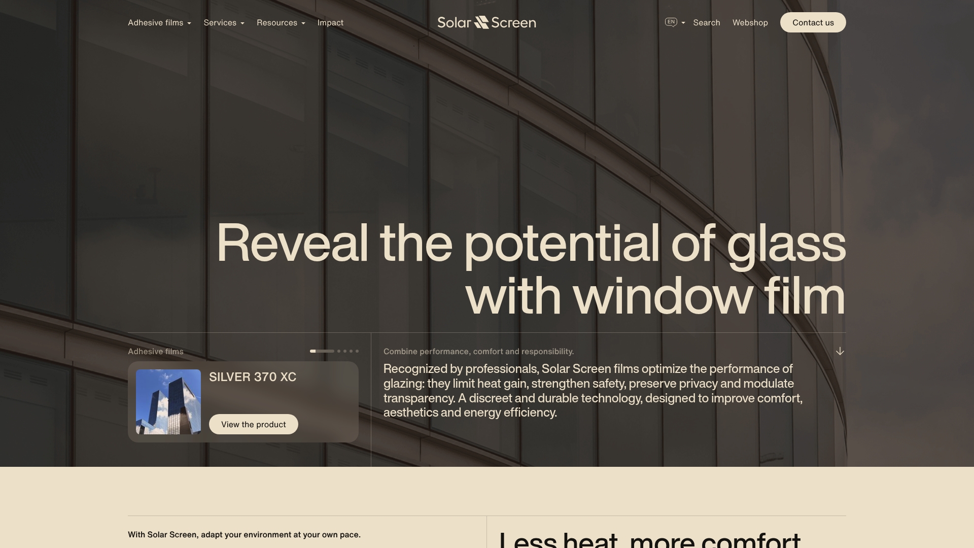 Solar Screen couvre une large gamme : contrôle solaire, films de sécurité, films décoratifs et solutions spécialisées comme le photochromique et l'anti-décoloration. La marque propose aussi des outils d'accompagnement tels que l'étude énergétique et un simulateur d'économies.