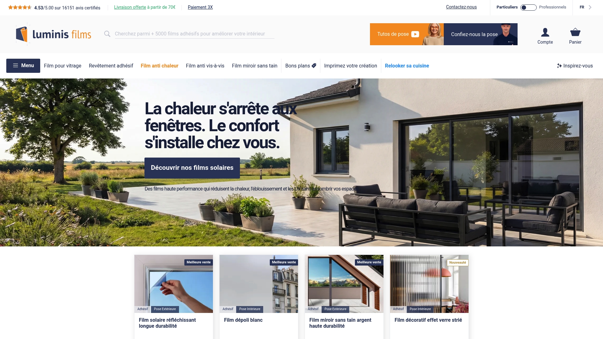 | Luminis Films | Choix varié, tutoriels pour une pose autonome, livraison rapide | Produits parfois indisponibles, manque d'un guide d'orientation clair | À partir de 9,18 € le m² | Décorateurs, particuliers et professionnels |