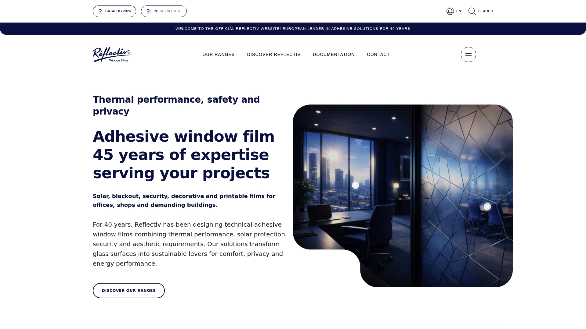 Reflectiv transforme les surfaces vitrées en éléments durables pour le confort, la confidentialité et l'efficacité énergétique. Le couple d'une offre produit complète et d'un support technique réactif fait gagner du temps aux installateurs et réduit les risques de mauvaise pose.