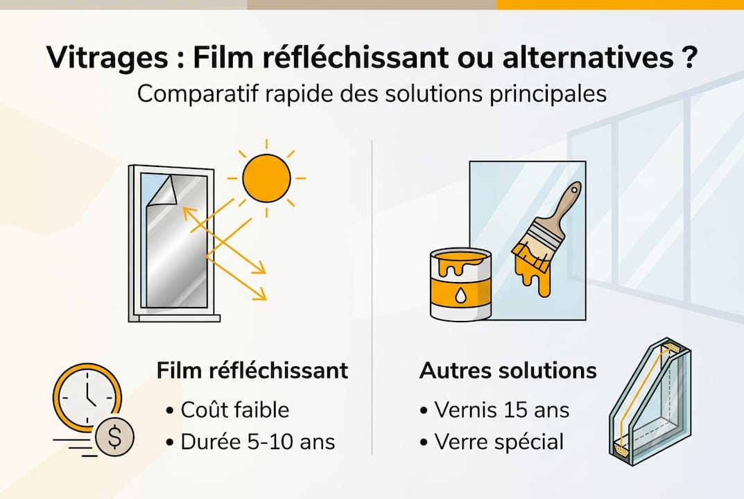 Pour prendre une bonne décision, il faut comparer. Le film réfléchissant n'est pas toujours la solution la plus adaptée. Voici les principales alternatives disponibles : vernis réfléchissants (durée de vie 15 ans), verre neuf intégrant un traitement réfléchissant (solution permanente), et les nouvelles générations de films non-métalliques.