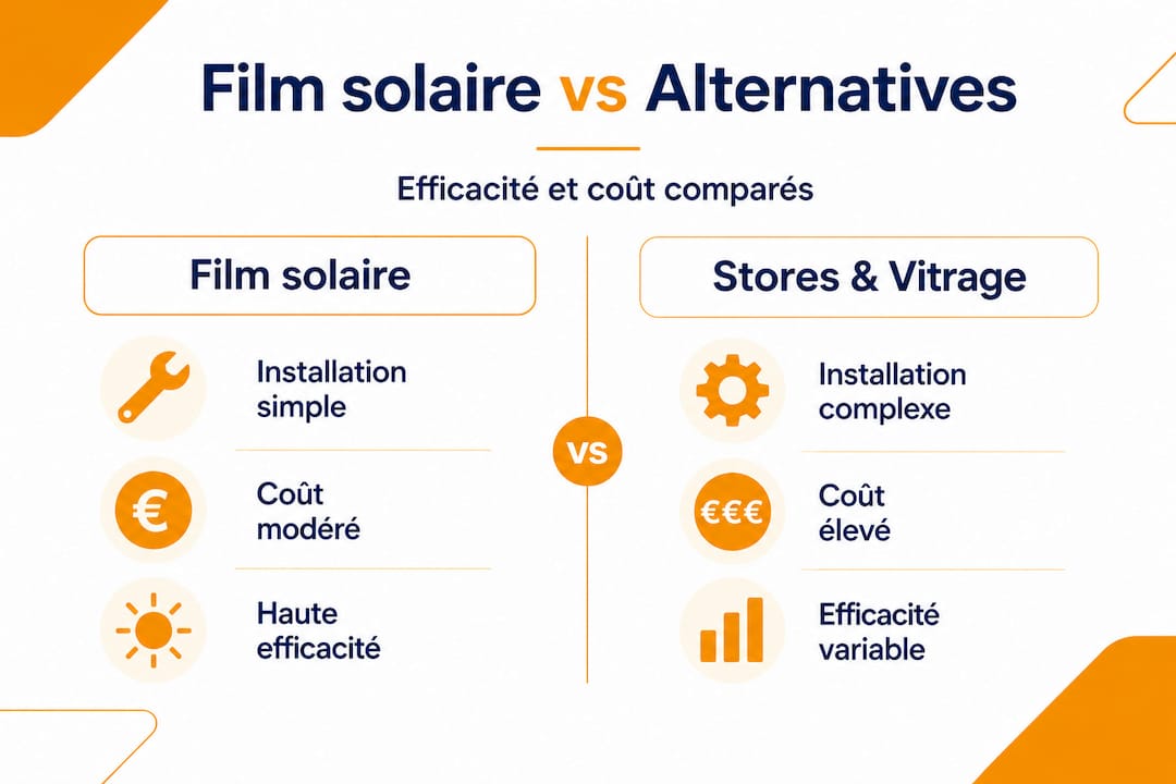 Le film solaire se distingue clairement par son rapport coût/efficacité. C'est une solution moins lourde que le changement de vitrage ou l'installation de stores extérieurs, sans compromis majeur sur la performance thermique. Et contrairement aux stores enrouleurs, le film agit en permanence, sans manipulation quotidienne.