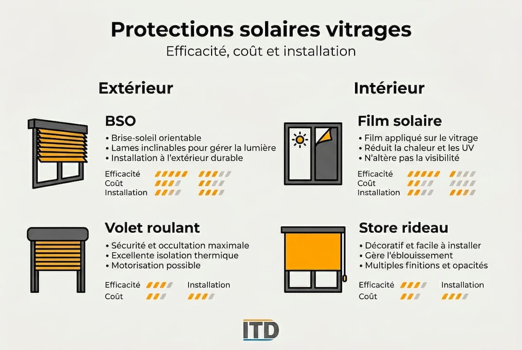En clair : les protections extérieures empêchent la chaleur d'entrer, les protections intérieures en limitent la diffusion une fois que le rayonnement a traversé le verre. Cette nuance change tout dans les bâtiments très vitrés.