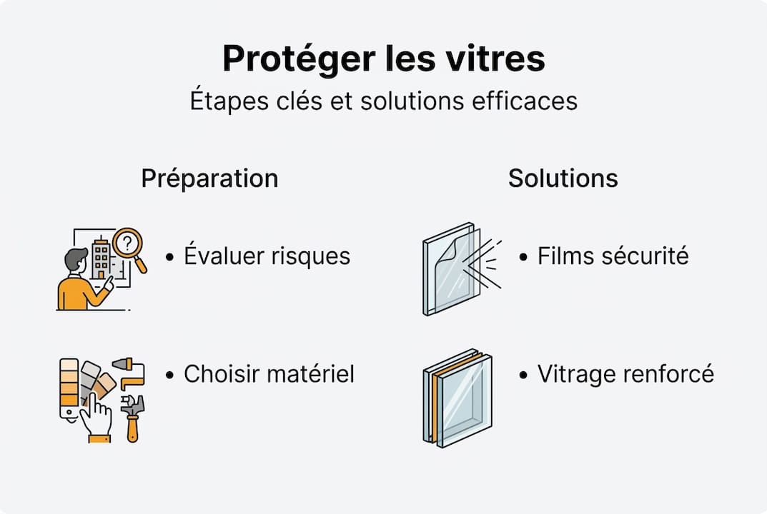 Les deux grandes options sont le remplacement du vitrage par un verre certifié (coûteux mais très robuste) et la pose d'un film de sécurité sur le vitrage existant (accessible, rapide et réversible). L'association entre ces deux approches, complétée par des volets ou une alarme, reste la stratégie la plus efficace contre les intrusions.